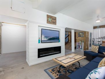 · A central focal point was built for the basement (shiplap wall with recessed and brand-new mounted TV and brand-new electric fireplace)